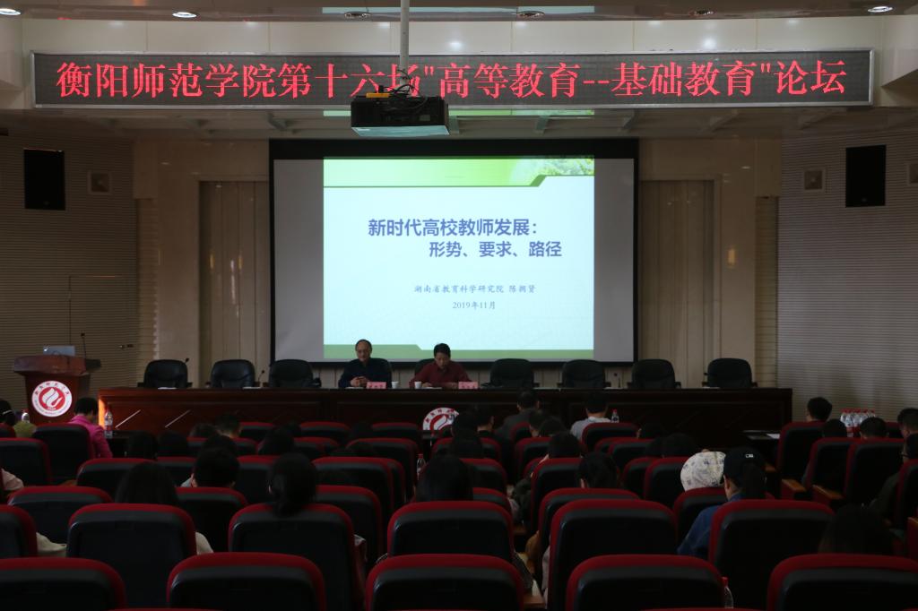 11月14日下午,我校“高等教育——基础教育”论坛第十六场学术报告会在东校区外语楼学术报告厅举行,湖南省教科院副院长陈拥贤研究员作题为《新时代高校教师发展:形式、要求与路径》学术报告,副校长张登玉教授主持报告会。