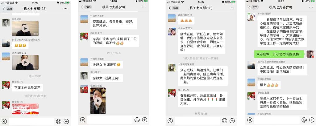 最后,全体党员发表自己的抗“疫”心声。践初心,担使命,众志成城,共克时艰!表达了全体党员的共同心声。机关第七支部全体党员担负着全校教学管理和质量监控的重任,如何应对突发情况下的新问题,需要党员积极作为。党员们的心声,彰显出坚决打赢疫情防控战的信心和决心!